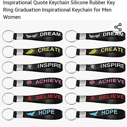 - 6 different designs: believe, dream, hope, achieve, create and inspire; With a flat metal key ring for holding keys, black with multi-colored accents