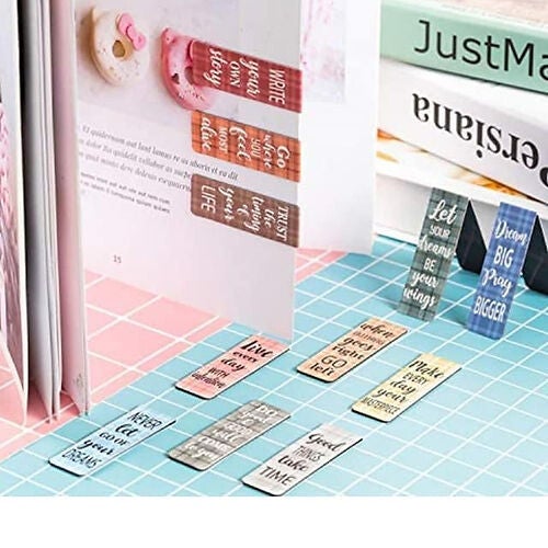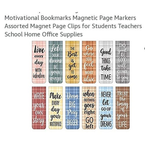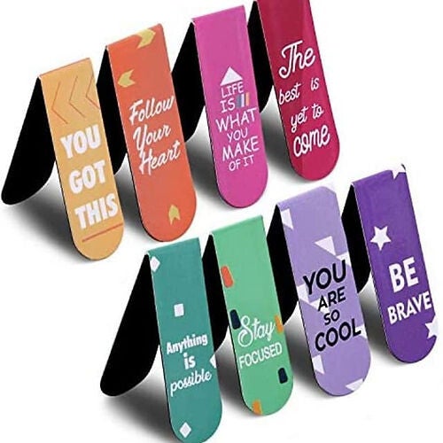 Never Lose Your Place Again. Quantity and size: You will get 12 differently styled inspirational magnetic bookmarks, Size: the folded size measures about 5 x 2 cm/ 1.97 x 0.8 inches, the unfolded size is about 10 x 2 cm/ 3.94 x 0.8 inches, portable: our magnetic bookmarks are printed with sayings to inspire and encourage you to become a better person. Use them to cultivate good reading habits and a positive and mature attitude towards daily life. Practical and beautiful: these beautiful magnetic bookmarks are a useful tool to record your reading progress decoratively. Quality material, lightweight but sturdy, not easy to fade, break or fall off, long lasting Wide applications: the assorted magnetic bookmarks can serve as bookmarks, rewards, birthday or holiday gifts, door prizes and so on
